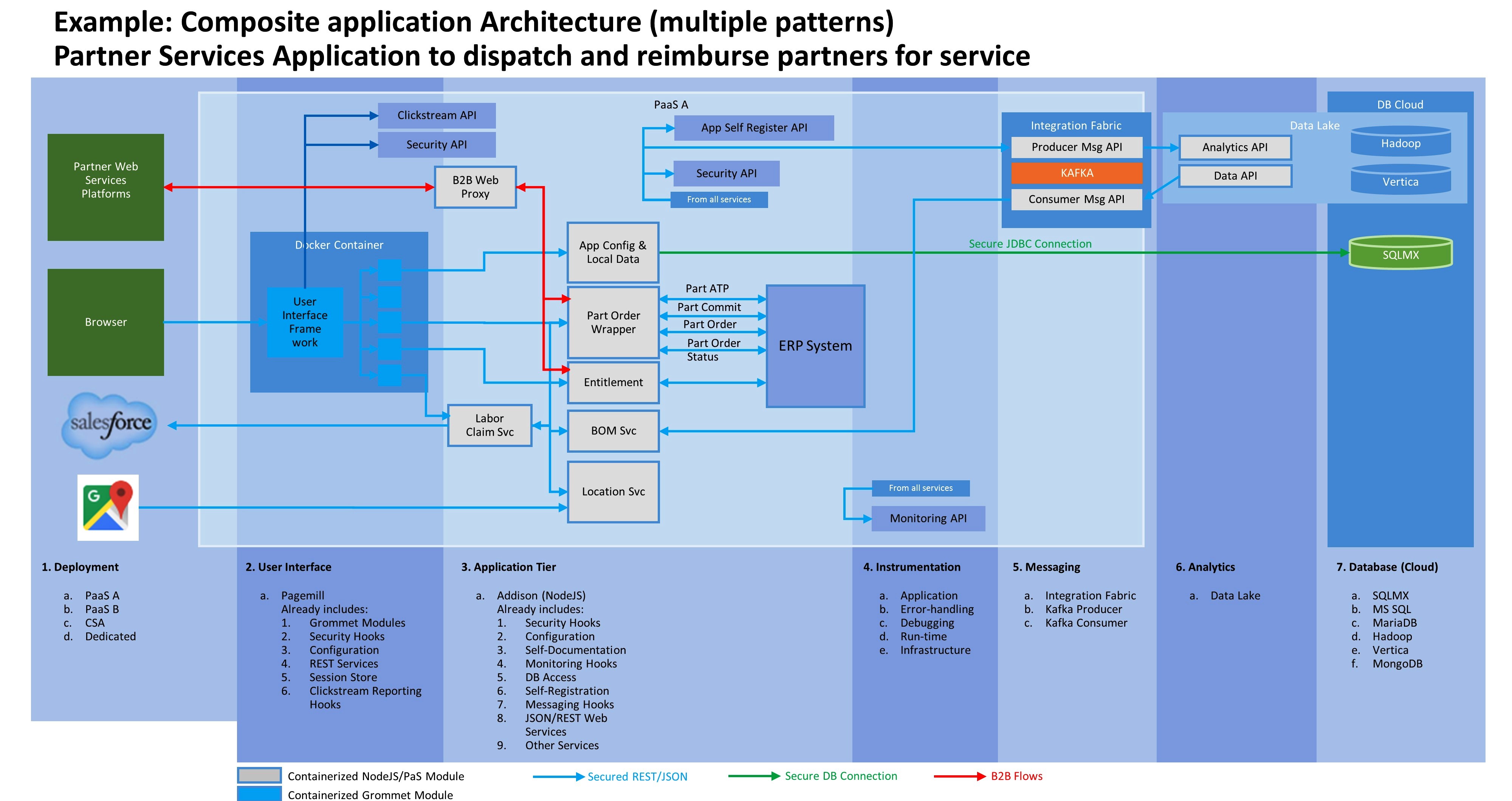 IT needs to provide Application Architecture patterns of use that describe how systems should be assembled to ensure interoperability and adherence to security policies. An architectural pattern is a general, reusable solution to a commonly occurring problem in software architecture within a given context.[i] Architectural patterns are similar to software design patterns but have a broader scope. The architectural patterns address various issues in software engineering, such as computer hardware performance limitations, high availability, and minimization of business risk. Some architectural patterns have been implemented within software frameworks. Below is an example of an Application Architectural pattern of use.