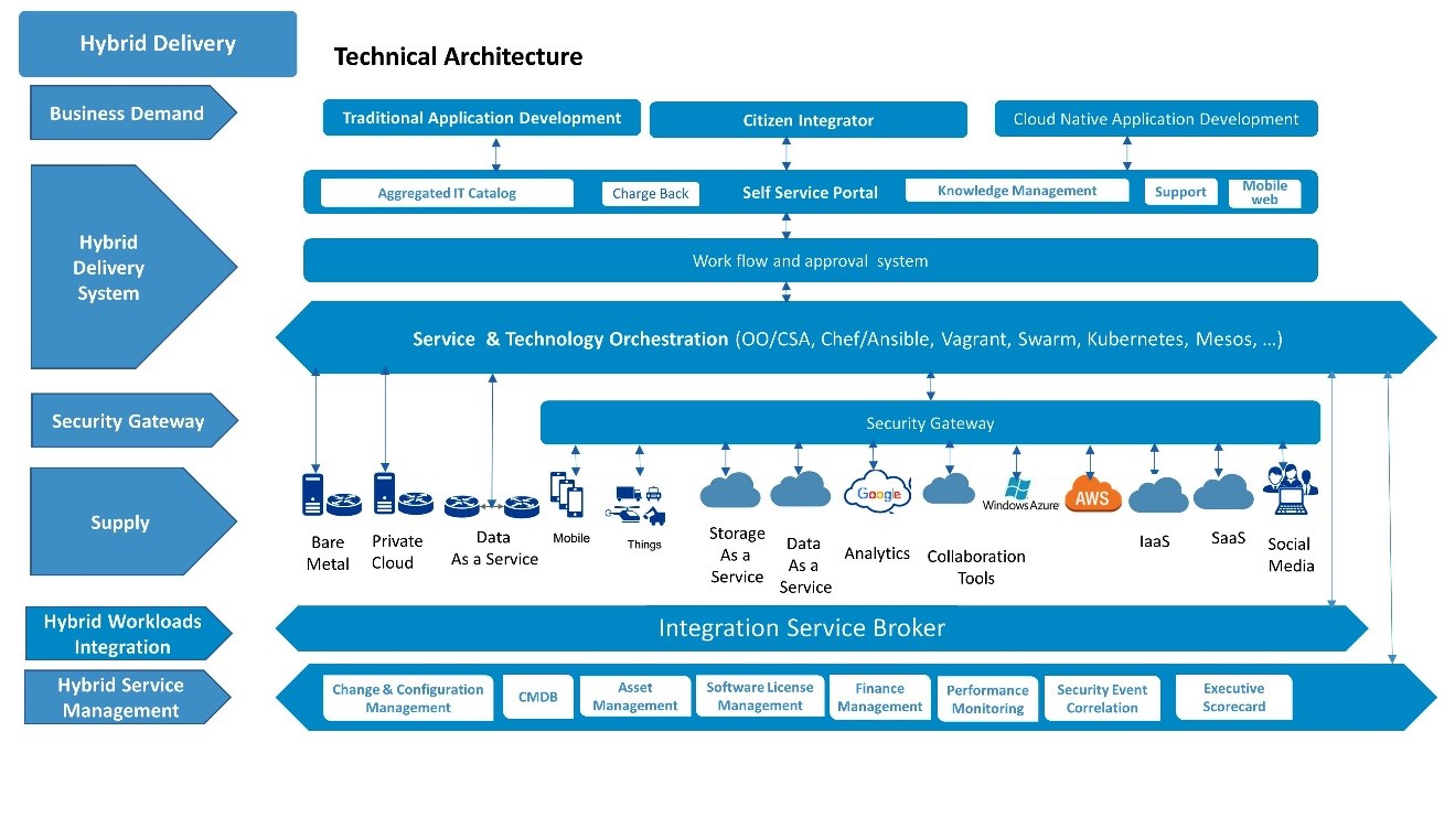 They need to deliver an Integrated Hybrid Service Portfolio of pre-approved cloud providers and SaaS suppliers that meet the service level expectations of their Business customers. They need to ensure those services adhere to the governance policies of their enterprise. The graphic below illustrates the Hybrid Delivery operational model.
