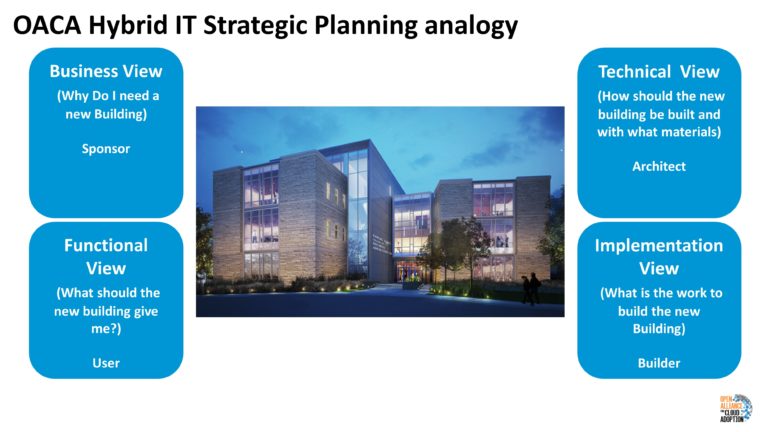 To develop a Hybrid IT Strategic plan, we use the analogy that we are constructing a new building for an Enterprise and that it is defined by four viewpoints. These points of view are: