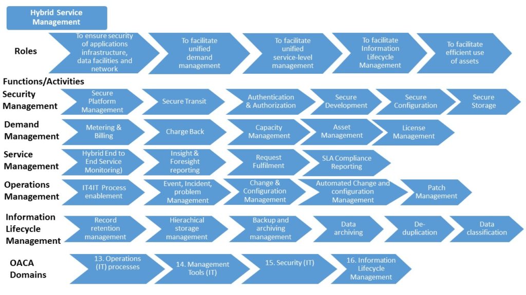 The following graphic outlines the work, roles, and OACA domains that service management involves. The overall responsibilities of the Shared responsibly model are as follows: