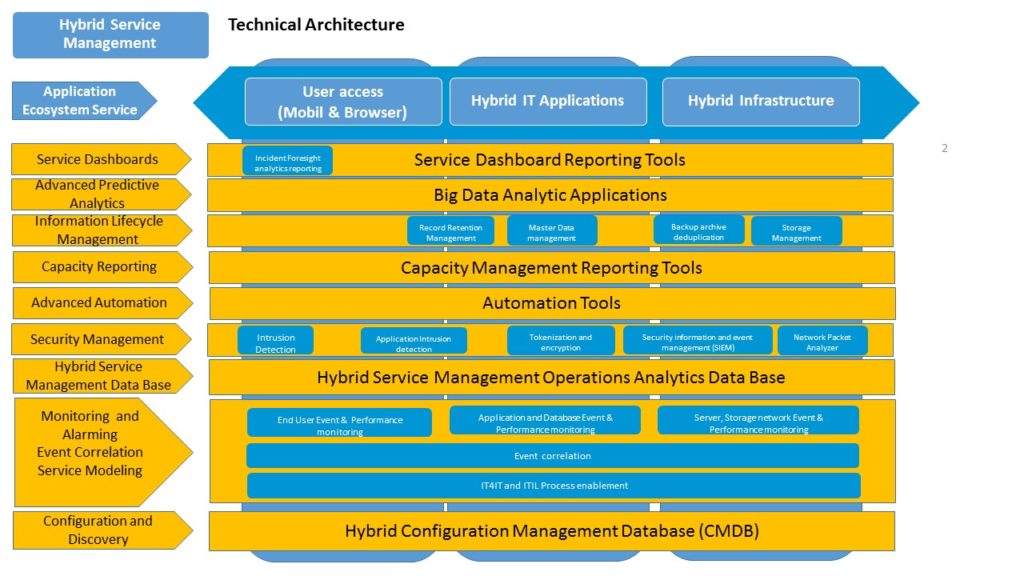 Below is an example of a technical architecture that reinforces a common Service Management Architecture. The tools are designed to look at a service as a whole, not just the individual components.