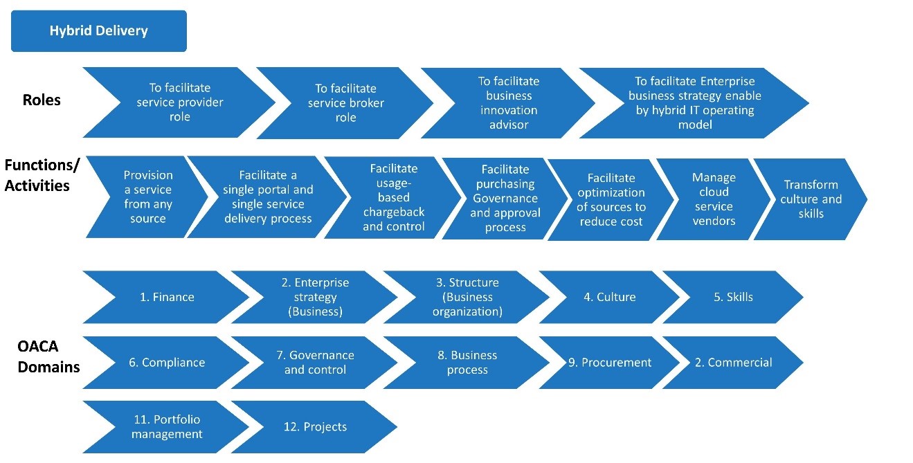 They need to deliver an Integrated Hybrid Service Portfolio of pre-approved cloud providers and SaaS suppliers that meet the service level expectations of their Business customers. They need to ensure those services adhere to the governance policies of their enterprise. The graphic below illustrates the Hybrid Delivery operational model.
