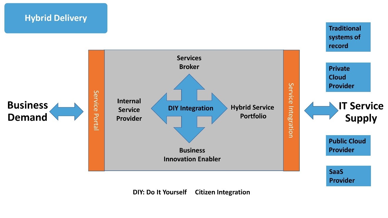 Business appreciates the ease of being able to order cloud services from providers such as Amazon. They want the same ease of provisioning for all their IT services. Hybrid Delivery must operate in the same way. A Hybrid IT Service delivery model acknowledges that all IT services are no longer delivered from within the walls of an IT organization. Services now can come from the public cloud, SaaS providers, private clouds, virtual private clouds, and traditional services. In a Hybrid Delivery Model, IT must become a one-stop shopping source for all IT services.